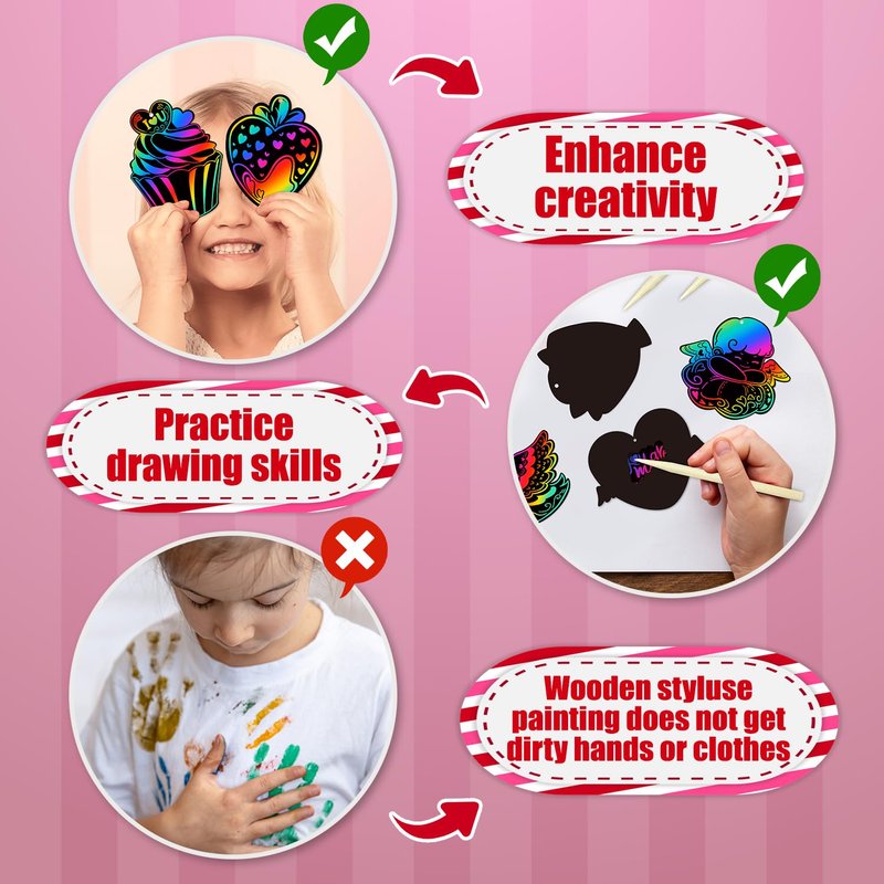 - 【Novel Painting Materials】The Valentines scratch cards are made of paperboard material. Brilliant colors and patterns are hidden under the black coating, no complicated art tools are needed, just use a wooden stick that can scrape off the black coating to complete a magic scratch paper.