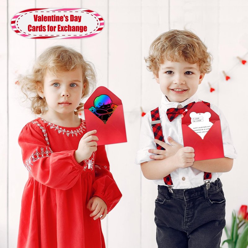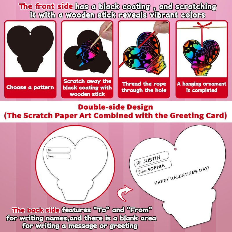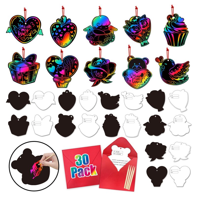 - 【Magic Valentines Scratch Paper Art】30 PCS Valentines scratch papers, 30 PCS wooden sticks, 30 PCS envelopes and 30 PCS ropes. Easy to get a magic and colorful Valentines scratch paper even a little kid. It's a fun Valentines classroom activity for kids to use their imagination.