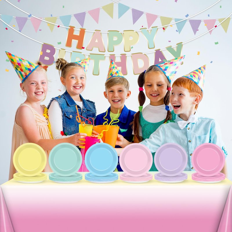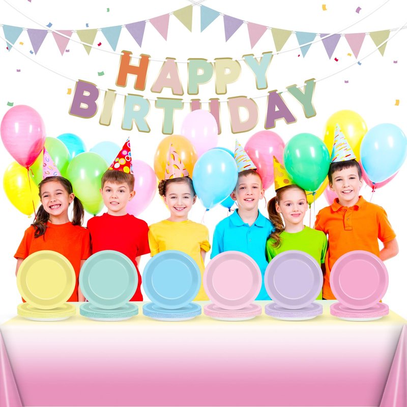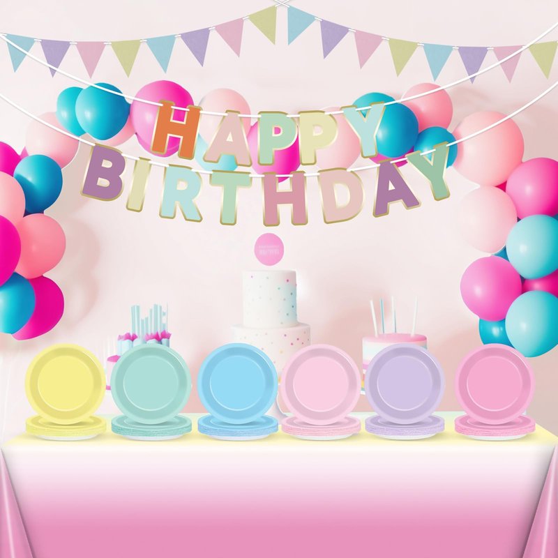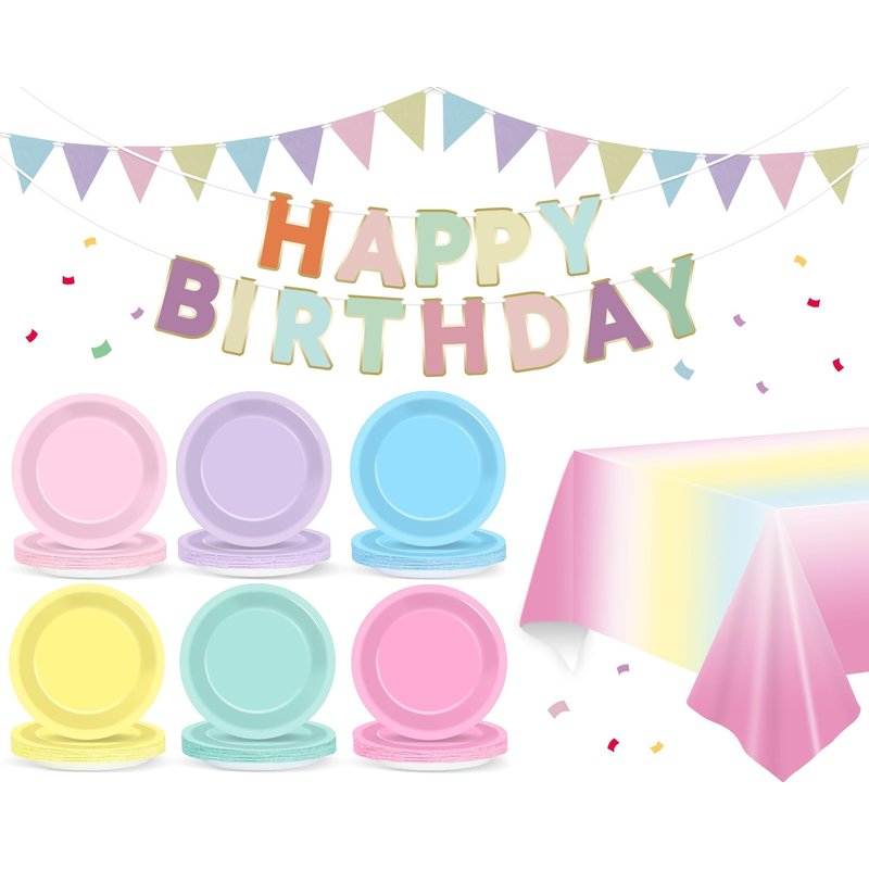- VERSATILE PARTY DECORATIONS: Whether you're hosting a pastel-themed party, a sophisticated preppy get-together, a baby shower party, or a special occasion like a birthday or bridal shower, our pastel party plates, tablecloths, and pennant sets are a great choice for any event planner!