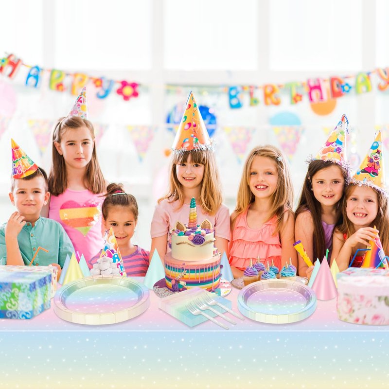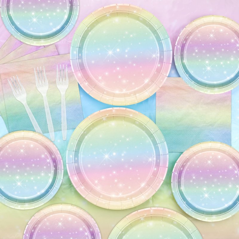 - 【Pastel Rainbow Themed Party Supplies】Package includes: 20 x 9'' dinner plates, 20 x 7'' dessert plates, 20 x napkins, 20 x forks, 1 x pastel rainbow tablecloth.