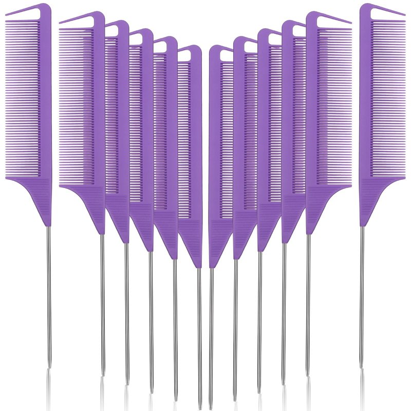 Patelai 12 Pcs Parting Comb for Braids Bulk, Rat Tail Comb for Parting Stainless Steel Pintail Comb Teasing Combs Braiding Comb Pressing Comb for Hair Styling Hairdressing Hair Salon Home(Purple)
