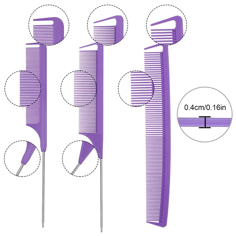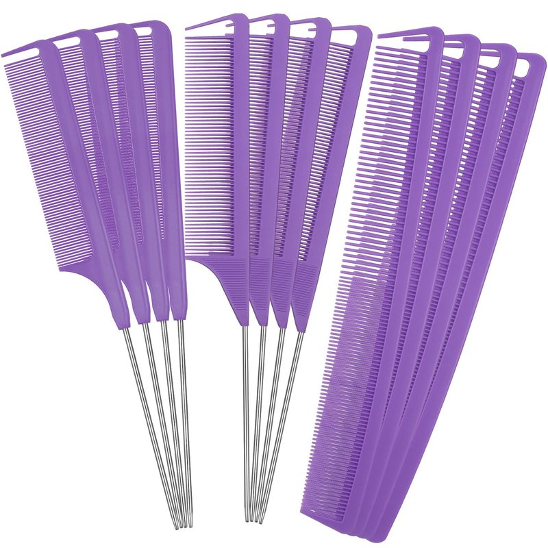 12 Pieces parting comb for braids rat tail comb steel pintail comb fine teeth comb heat resistant teasing combs with stainless steel pintail Feature: Nice performance: Our parting comb contains good heat-resistant and static-resistant performance, can work with hair dryer and prevent your hair from flying or curling during the styling process. Share with others: These teasing combs allow you to design your personalized hairstyle at home, you can share as small gifts with your mom, sister, girlfriend, friends and more. Specification: Material: plastic, stainless steel Color: purple Quantity: 12 pieces Package include: 12 x Parting comb Note: Pointed parts include, please keep away from little kids. Manual measurement, please allow slight errors on size.