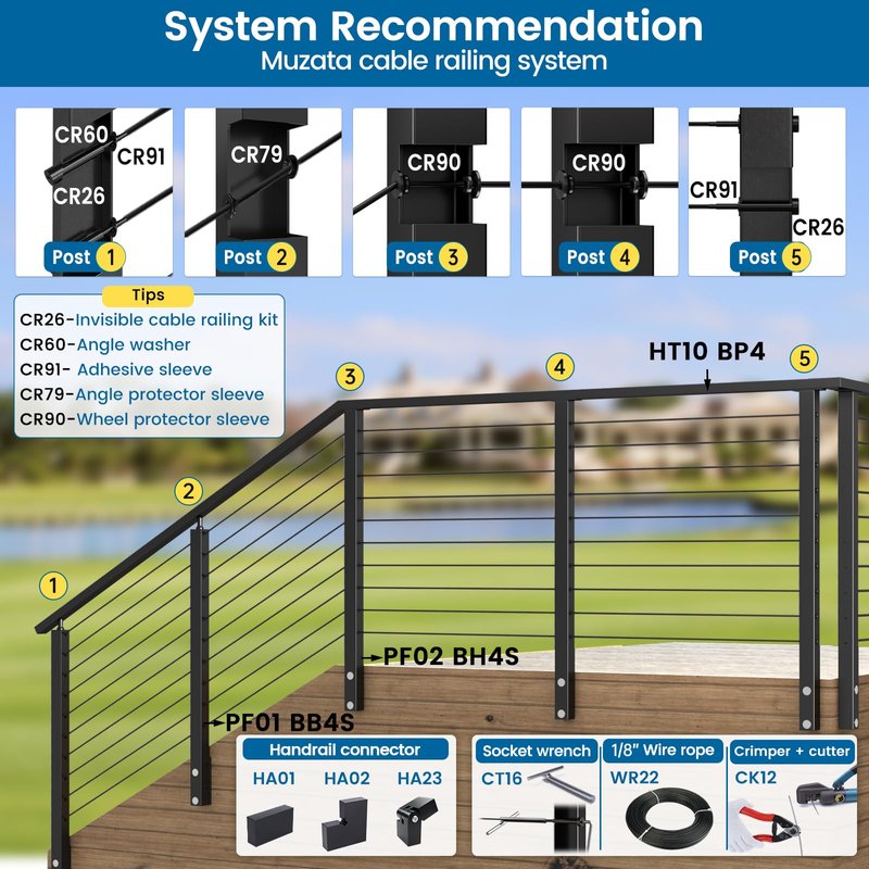 - Advice for constructing a system - To help you build a cost-effective BlackCool cable railing system more efficiently, we recommend the following product combinations from Muzata, including post (PS01-angle top, PS02-flat top), handrail(HT10), cable railing kit CR26 and CR07, angled washer CR60, wire rope WR17, protector sleeve CR90, adhesive sleeve CR91, crimper and cutter CT01, socket wrench CT16, handrail connnector(HA01 HA02 HA23 HA24)