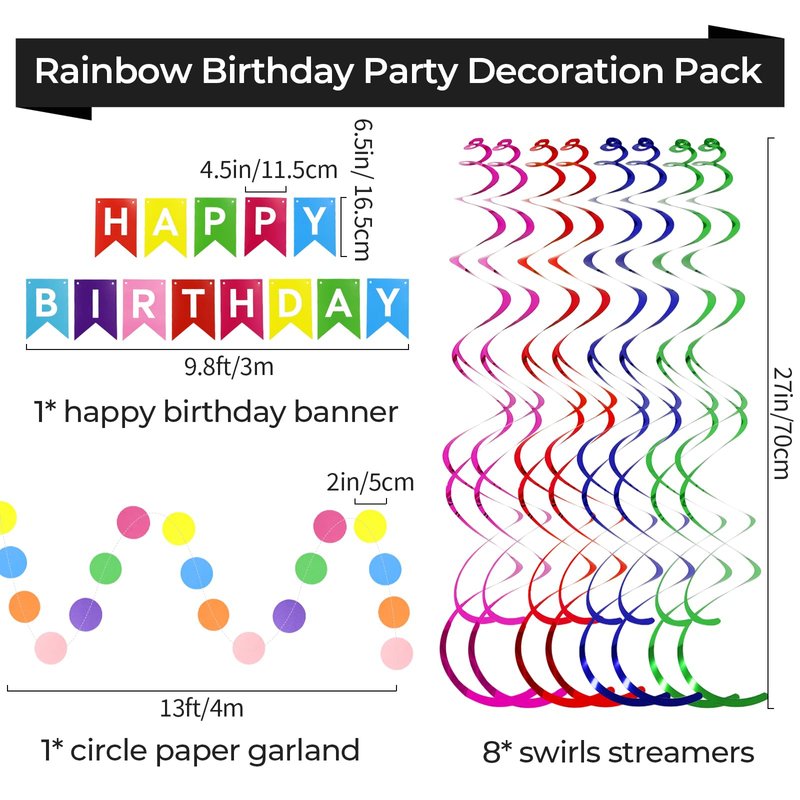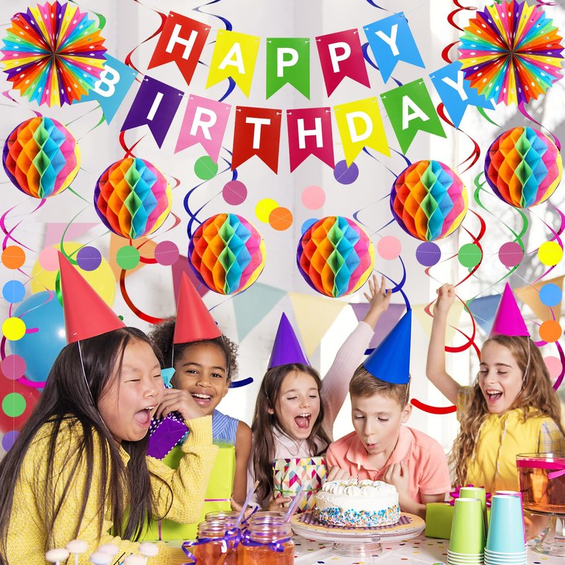PatiCool Happy Birthday Party Decorations Pack with Rainbow Happy Birthday Banner, Honeycomb Balls, Circle Dot Garland, Paper Fans and Hanging Swirls Streamers