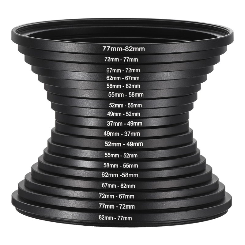 - ⭐Include 9 PCS step up rings filter ring adapter set: 37mm to 49mm , 49mm to 52mm , 52mm to 55mm , 55mm to 58mm , 58mm to 62mm , 62mm to 67mm , 67mm to 72mm , 72mm to 77mm , 77mm to 82mm; ⭐Include 9 PCS step down rings filter ring adapter set: 82mm-77mm, 77mm-72mm, 72mm-67mm, 67mm-62mm, 62mm-58mm, 58mm-55mm, 55mm-52mm, 52mm-49mm, 49mm-37mm
