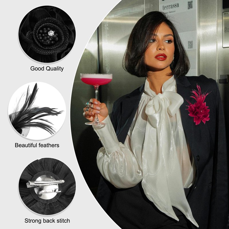 PATIKIL Floral Hair Clip, 2 Pcs Elegant Flower Feather Brooch Pin Hat Silk Wedding Party Dance Banquet Pins Accessories Camellia Charm Lady Dress Suit, Black