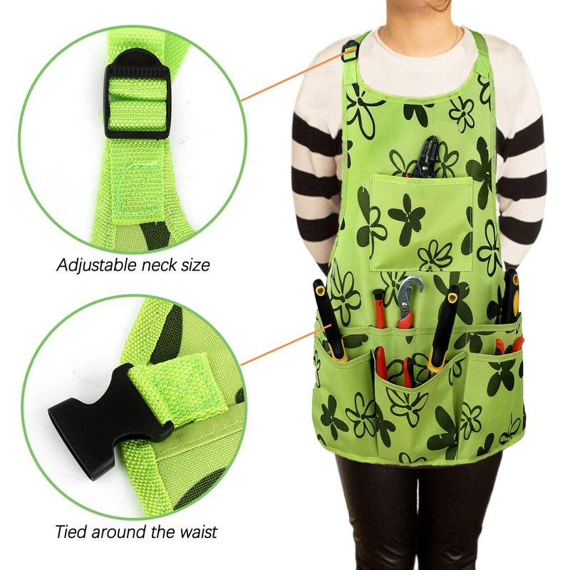 - 【ADJUSTABLE SHOULDER STRAP DESIGN】Unique shoulder strap design, flexible adjustment of apron size, waist and shoulder straps adjust from 28in–52in to fit wide variety of sizes. Garden Tools Aprons' neck and waist straps are double stitched. Gardeners wear for a long time without burdening the skin. The reinforcement of the pockets and the apron edge can make the whole apron stronger and more durable.