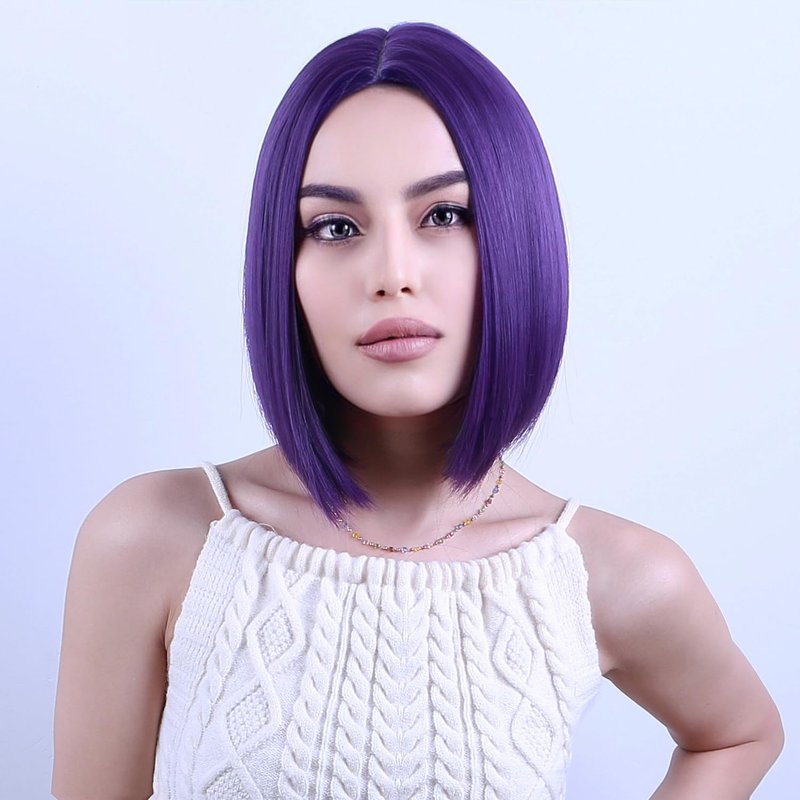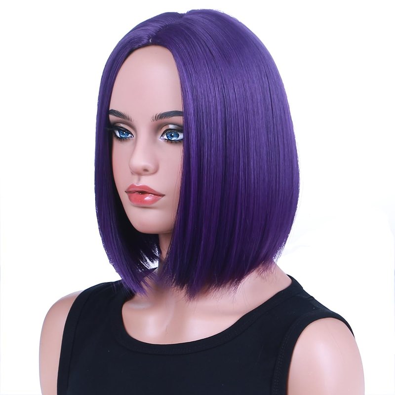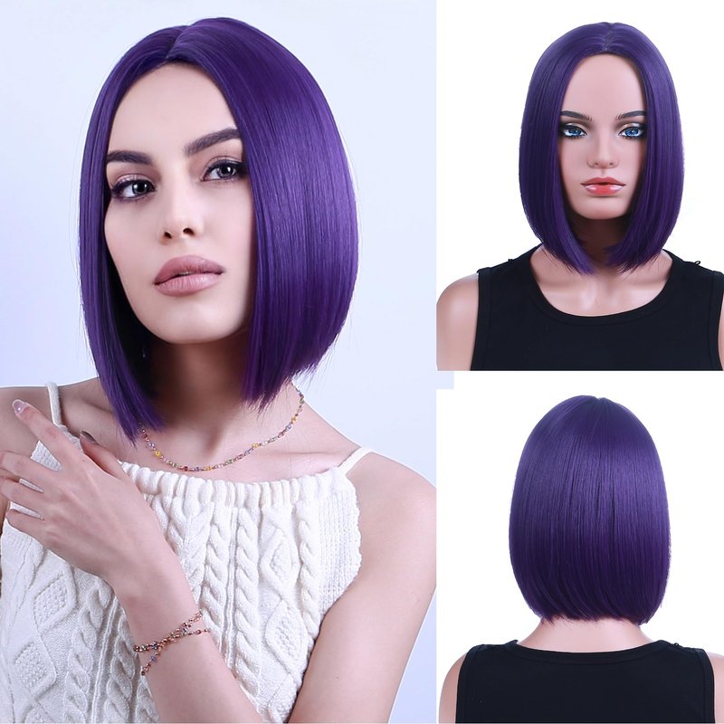 PATTNIUM Dark Purple Bob Wig for Women Short Straight Purple Wig with Bangs Short Purple Bob Hair Wigs Heat Resistant Synthetic Wig with Wig Cap