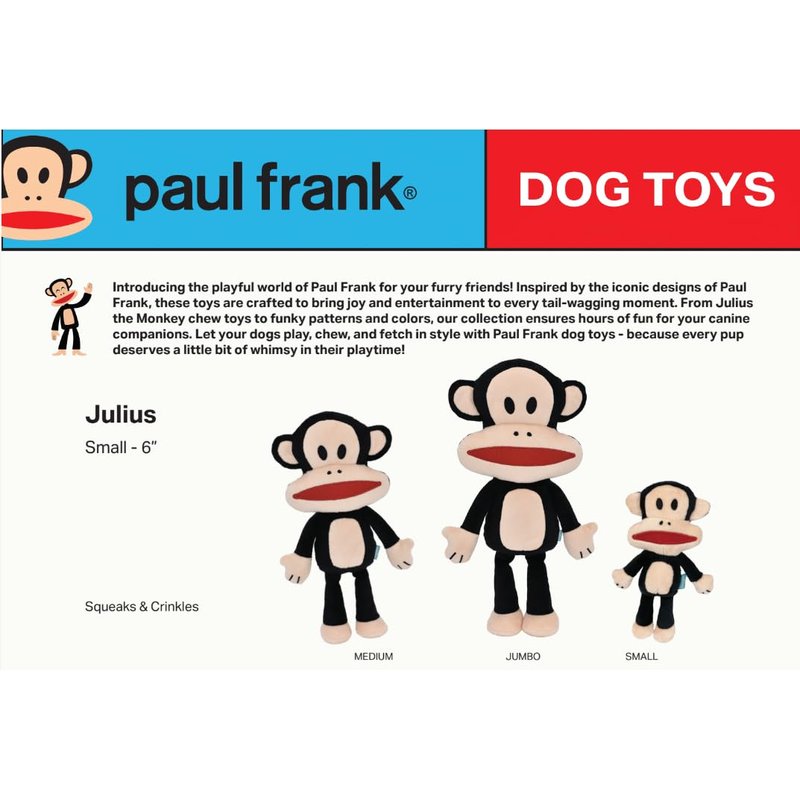 - Encourages active play: The Monkey Paul Frank Julius 6" dog toy is a fun and colorful toy designed to entertain dogs during playtime. The toy provides dogs with an outlet for their natural instincts to chew, chase, and play.