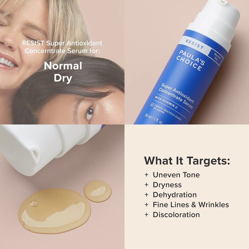 - Paula's Choice RESIST Super Antioxidant Serum with Vitamin C is a silky serum with stabilized Vitamin C & peptides plus potent antioxidants that restores hydration to dry sun damaged skin. A skin care shelf essential for improving visible signs of aging