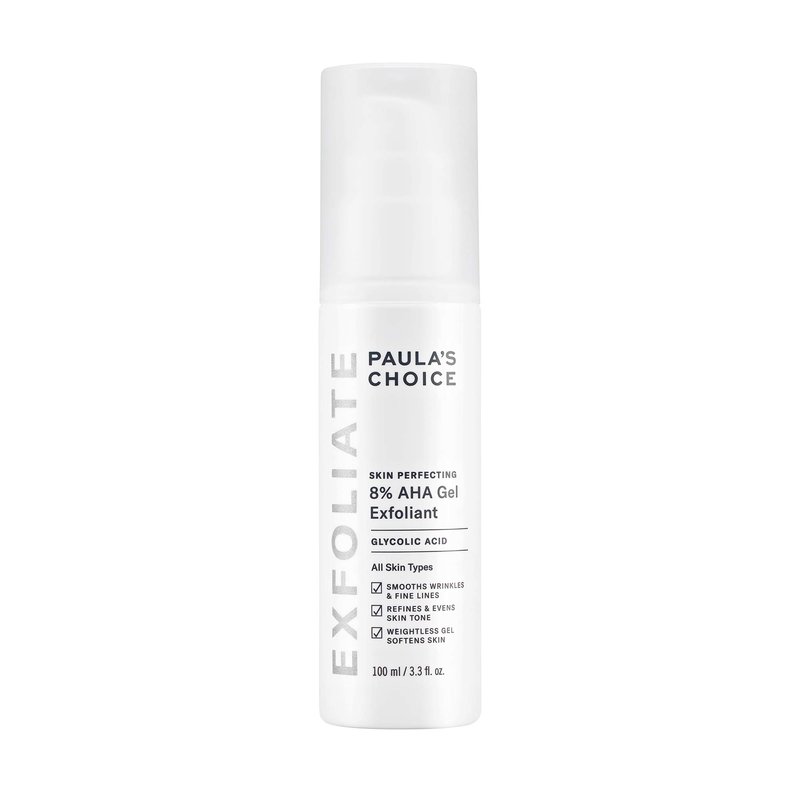 - Paula's Choice SKIN PERFECTING 8% AHA Gel Exfoliant with Glycolic Acid, Chamomile, and Green Tea can help minimize the look of discolorations and age spots, and with consistent use can increase skin's firmness. Use after cleanser and toner twice daily.