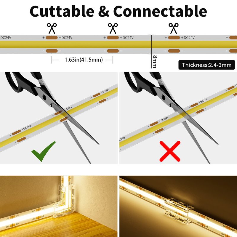 - SUPER BRIGHT & LONGER LENGTH: Never heard of COB LED Strip Light?A COB(Chip On Board) LED light has multiple chips on the PCB (Printed Circuit Board) than SMD Type,3780 LEDs on this 24.6ft/7.5m COB LED Strip Lights(504LEDs/m),which creates super even lighting performance,NO DARK SPOTS! 2700K color temperature,you'll enjoy an incredibly bright illumination with improved color quality