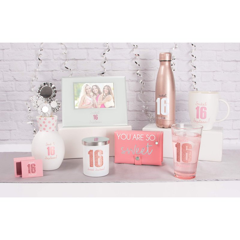 - IN-HOUSE DESIGN: "Sweet Sixteen" text, and glitter "16" are both printed onto the front of the frame beneath the replaceable photo.