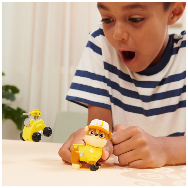 - LAUNCH RESCUE DRONE: When it’s time for an action-packed rescue, clip the rescue drone toy onto Rubble’s backpack then press the badge on his chest to launch the drone and save the day!