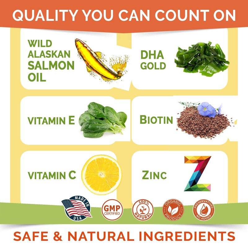 - Natural Omega 3 for Dogs - with salmon fish oil and natural algae, these chewable supplements is packed with valuable Omega 3 6 9 fatty acid (with EPA and DHA), vitamins, minerals essential for your dog's health.
