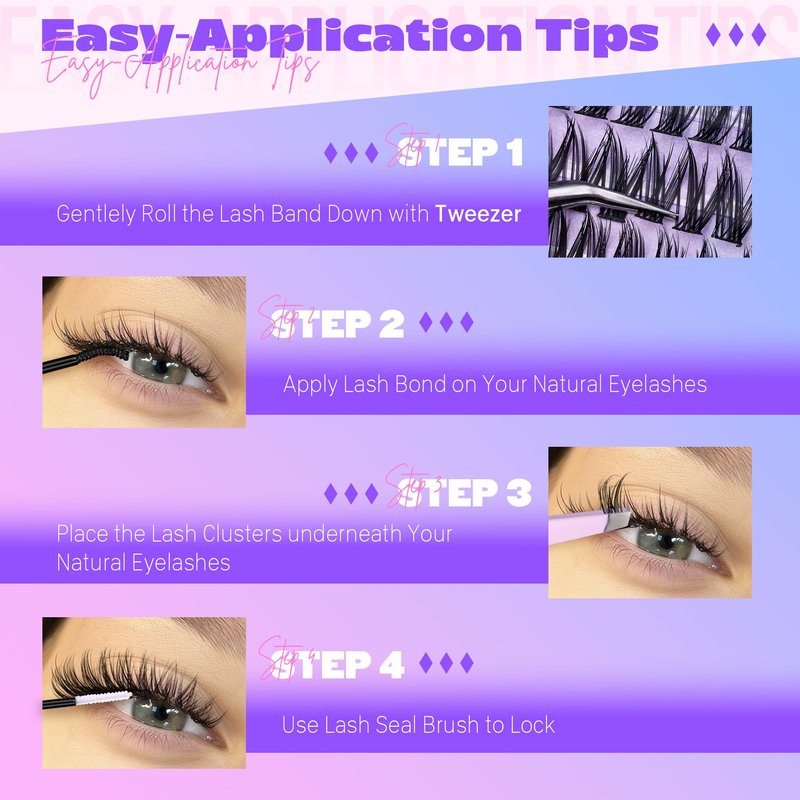 - Easy-Application Tips: Gentlely roll the lash band down with tweezers; Apply lash bond on your natural eyelashes; Place the lash clusters underneath your lashes; Use lash seal brush to lock