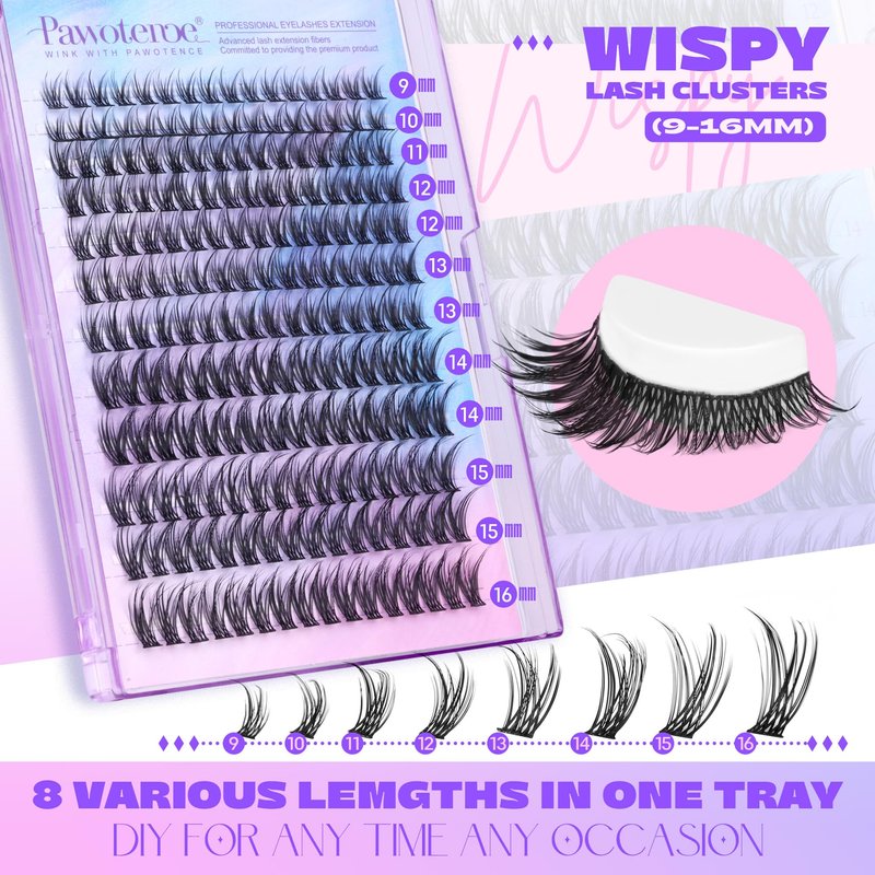 Pawotence Lash Clusters Wispy 9-16mm Individual Lashes Cluster Eyelash Extensions 192pcs Lash Extension DIY Soft Natural Eyelash Clusters with Thin Band