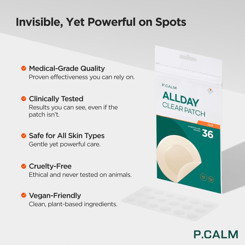 - 🌿 GENTLE YET EFFECTIVE - Specially formulated with Korean Hydrocolloid, Niacinamide, Salicylic Acid, Tea Tree Oil, and Centella Asiatica Extract, P.CALM Allday Clear Spot Patch offers powerful care for sensitive skin while effectively targeting blemishes and breakouts.