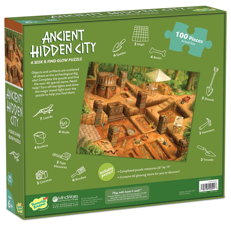 Peaceable Kingdom Ancient Hidden City Puzzle – 100-Pc. Seek & Find Glow Puzzle for Kids Ages 6 & Up – Included Blacklight Reveals Hidden Items – Great for Home or Classrooms
