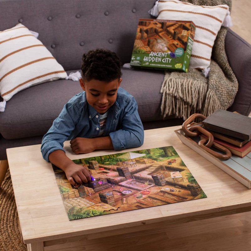 - Seek and Find Special Glow-in-the-Dark Items: Turn off the lights and shine the included blacklight on this Ancient City puzzle for kids to discover over 40 hidden items. This seek and find activity challenges children to pay close attention to the smallest details…and rewards their hard work with archaeologic fun!