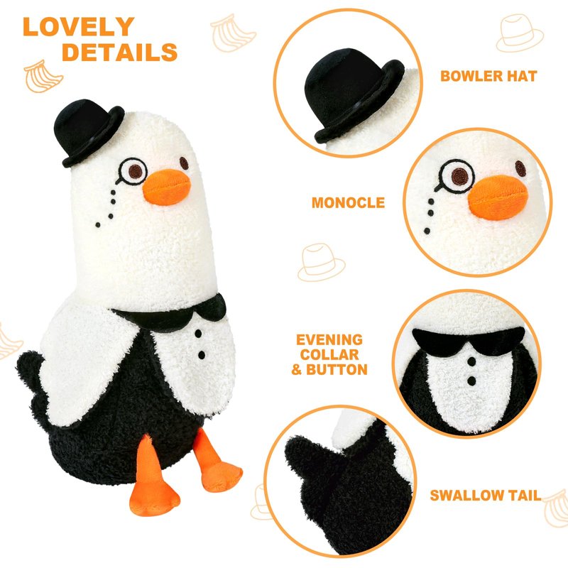- Unique Design: The banana duck plush is designed in a gentleman image, wears a bowler hat, monocle, evening collar and button, which is cute and unique in appearance.