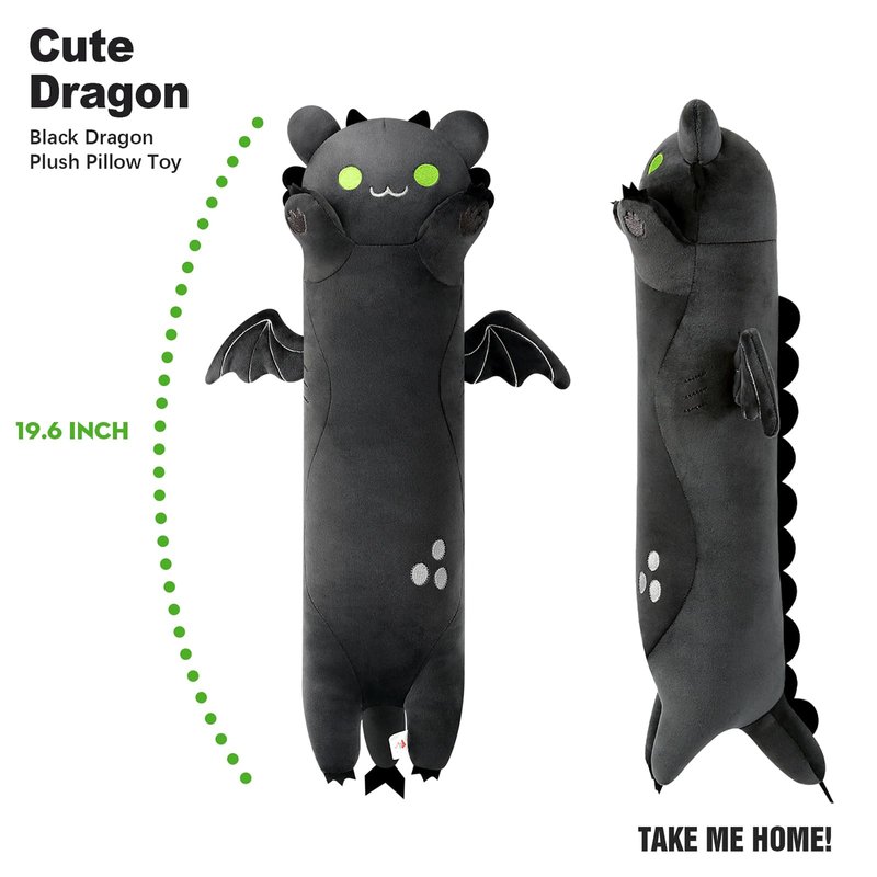 - Size: The length of the black dragon cat plush is 19.6"(Manual measurement may be 0.5-1.5 inch error). This dragon cat stuffed animal is good size to hold it. And it has lovely dragon horns, claws and black wings.