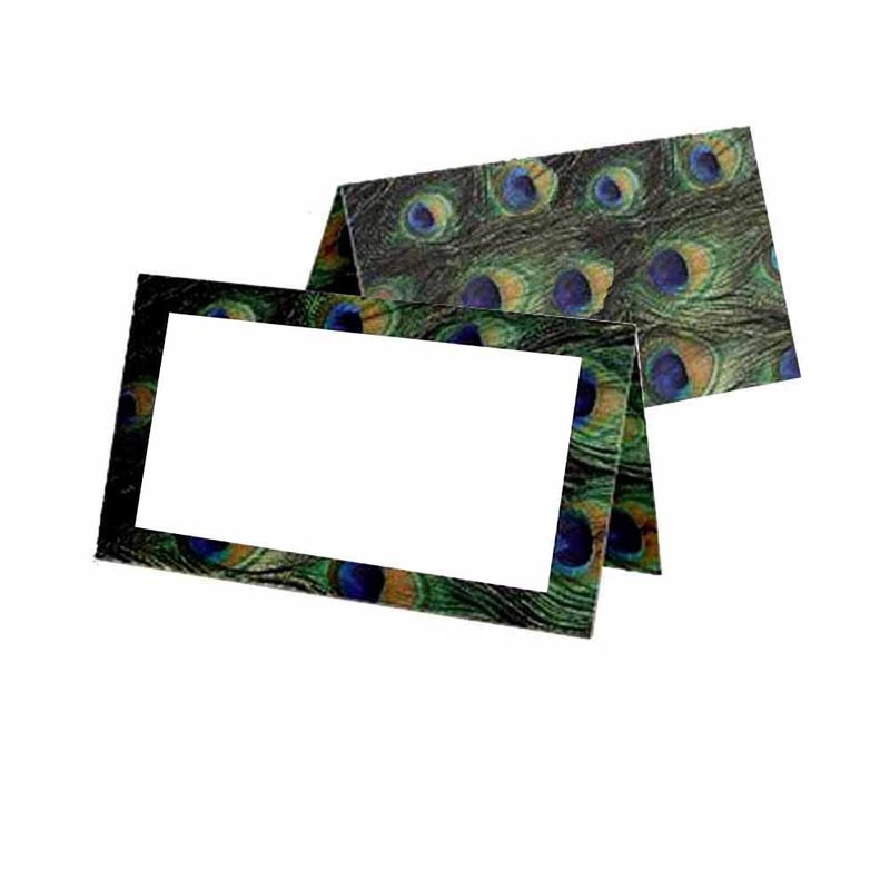 Peacock Print Place Cards - Tent Style - White Blank Front with Border - Placement Table Name Seating Stationery Party Supplies - Any Occasion or Event - Dinner Food Display - Product Tag Label Set