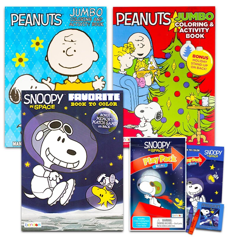 - This Peanuts Snoopy coloring and activity book set will provide many hours of fun. Each coloring book measure 8x11 inches and has approximately 64 pages. This set also includes mini Snoopy play pack.