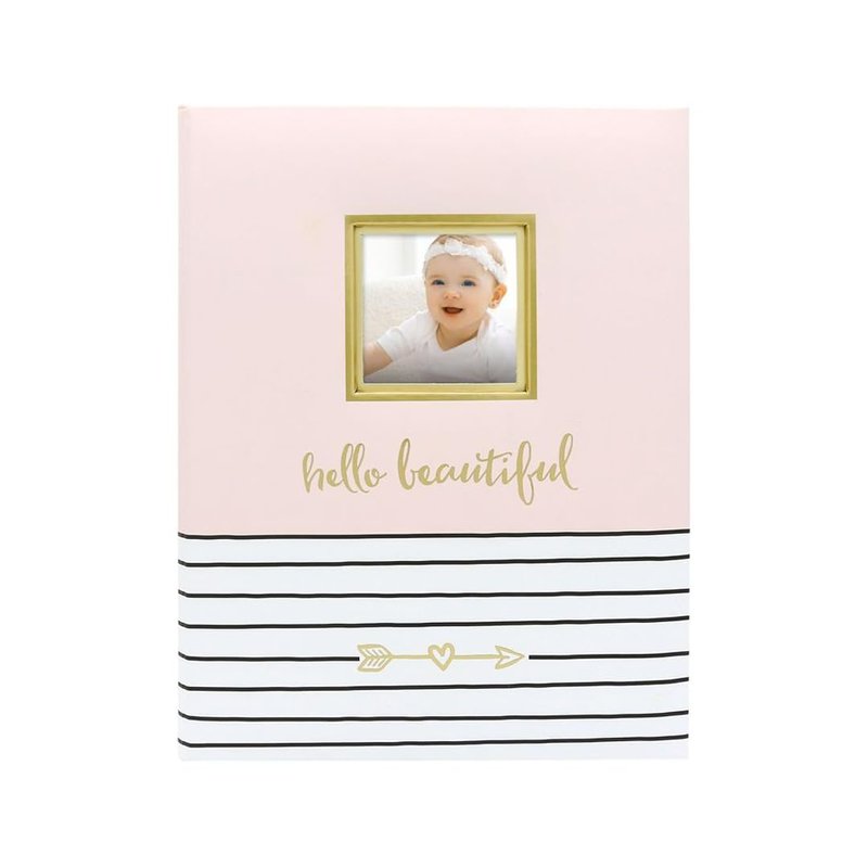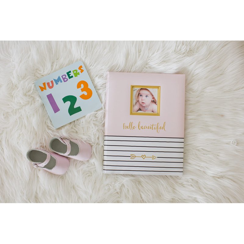 - Pretty in Pink: Introducing the 'Hello Beautiful' baby book, with its charming light pink fonts and 50 pages, perfect for capturing and sharing your precious stories. The stylish light pink cover, adorned with white and black stripes and a gold foil arrow, includes a 3” x 3” slot for your favorite baby photo.