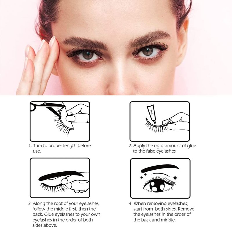 - HOW TO APPLY - 1. Carefully remove the eyelashesfrom the case with tweezers. 2. Compare false eyelashes with your eye line length, trim to suitable length and width. 3. When using it for the first time, please use tweezers to remove the glue on the band used to hold the lashes in place. 4.Brush lash glue on the lash band. 5.If necessary, apply eye shadow or eyelinerto make your eye line look more natural.