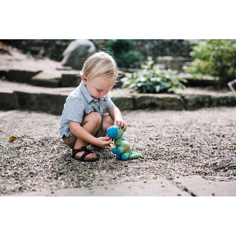 - Let your child's imagination wander back to prehistoric times with this darling stegosaurus dinosaur knit toy. Featuring delicate little stitched details, this charming crochet rattle is handmade with soft cotton yarn and makes a gentle jingle while playing