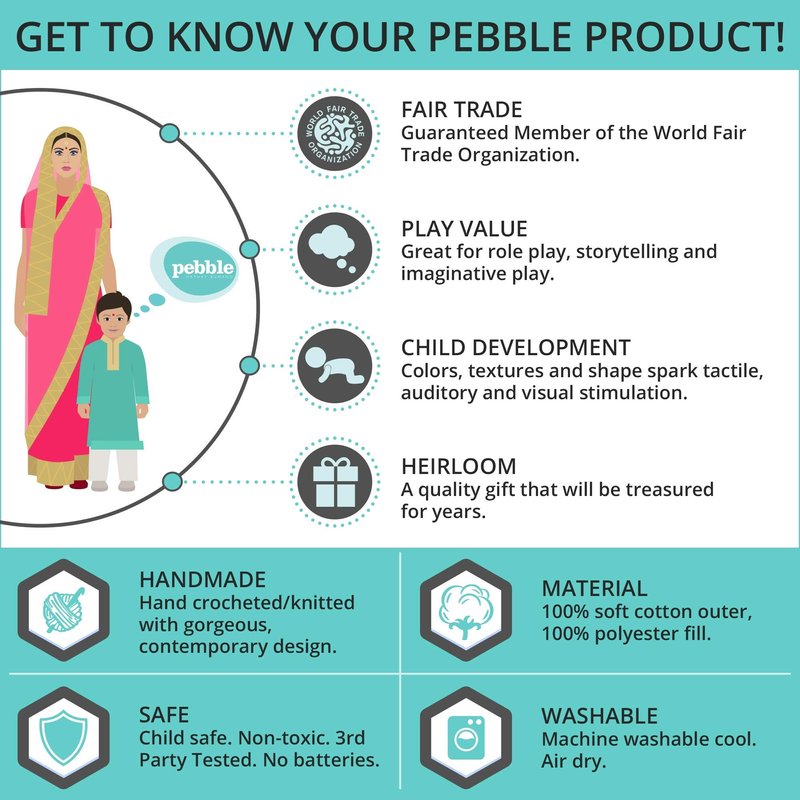 - HANDMADE & FAIR TRADE - Pebble is a guaranteed member of the World Fair Trade Organization. Each Pebble toy is lovingly crocheted/knitted with gorgeous, contemporary design.