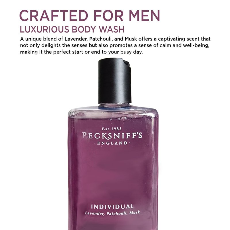 Elevate your daily grooming routine with Pecksniffs Men's Individual Bath & Shower Gel. This luxurious body wash has been crafted for men who love indulging in the finer aspects of self-care. With a rich, creamy lather that effortlessly cleanses and revitalizes your skin, you'll step out of the shower feeling refreshed and invigorated every day. Its unique blend of Lavender, Patchouli, and Musk offers a captivating scent that not only delights the senses but also promotes a sense of calm and well-being, making it the perfect start or end to your busy day.