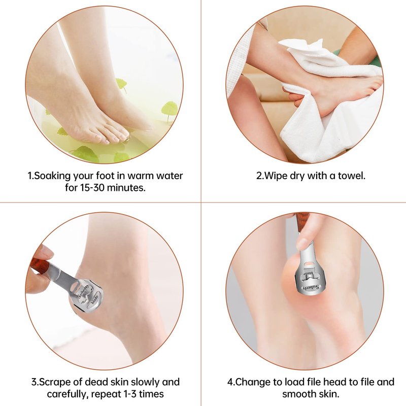 2-in-1 Callus Remover, the blade head quickly removes dead skin from the feet, and the small file head has a 0.5mm gap accuracy, suitable for thinner skin such as toes, or skin that cannot be reached by a large pedicure file. Soak it in hot water for 10 minutes, and then remove it in several times. The thicker ones can be removed 2-3 times a week. If you see the pink skin, you don't need to remove it, so as not to hurt the skin.