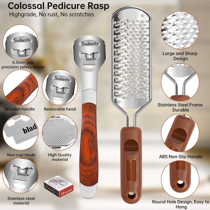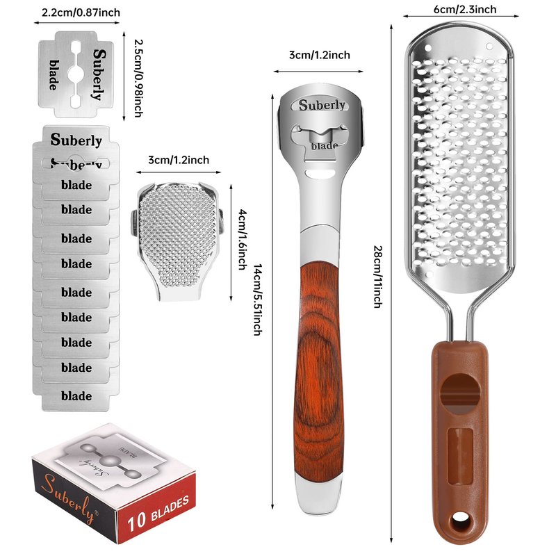 - 🦶Detachable Blade Design: The pedicure set is designed with a detachable blade head, which is very convenient to replace the reusable blade or the rasp head, the large stainless steel foot sharpener has a sharp stainless steel wave pattern, this design allows you to quickly Remove calluses and dead skin from feet.