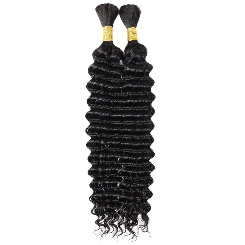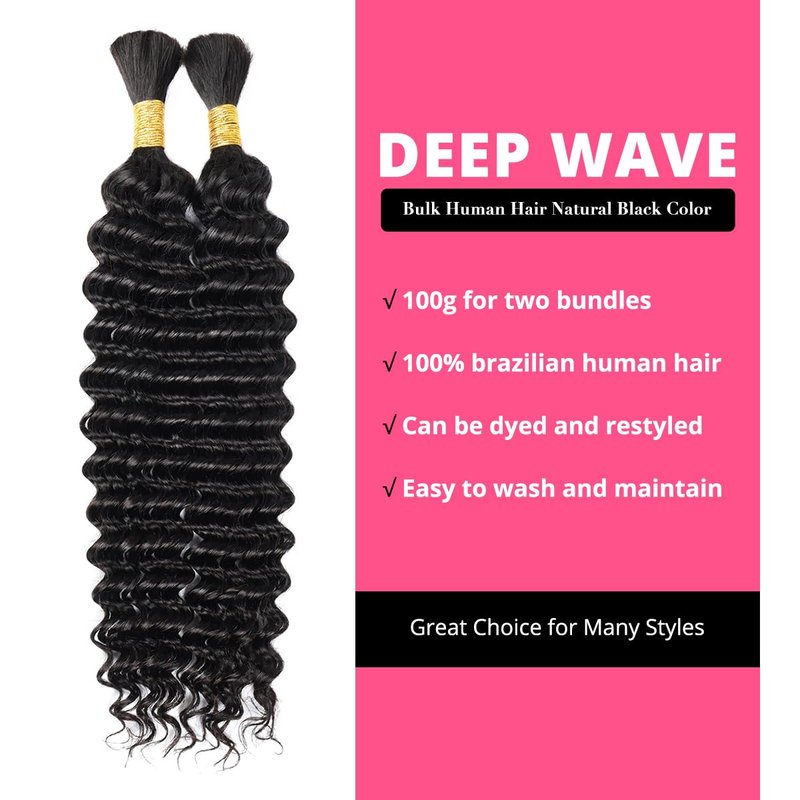 Deep wave braids are the best hair extensions for weaving because deep wave bulk no weft human hair doesn't harm the scalp and is silky soft. It is suitable for different styles and it can help you to attend any party with a beautiful image. Deep wave braiding hair can be can be bleached, dyed, permed and styled; Longevity; Pre-Stretched Smooth ends; No Tangle & No Shedding; and the material is virgin Brazilian human hair, the styling can be made to last longer with care. Deep wave hair made from 100% real Brazilian no process human hair, it's natural (virgin)human hair, Clean Without Any Chemicals and Odors, won't get tangled and won't hurt your skin. Human hair is natural black color .The length of human hair bulk is from 16 inch to 30 inch,the weight of single bundle is 50g. According to the actual need to use more combinations .Choose the human hair bundles quantity combination based on actual human hair braiding needs. Our bulk human hair is different from the general hair extensions,there is no weft, making it incredibly versatile for various braiding styles. Such as box braids, cornrows, curly loose wave hair styles,etc. You can also use it to add length and volume to your natural hair. Suitable for daily life,wedding,dating,graduation ceremony,vacation,parties,gifts and so on.