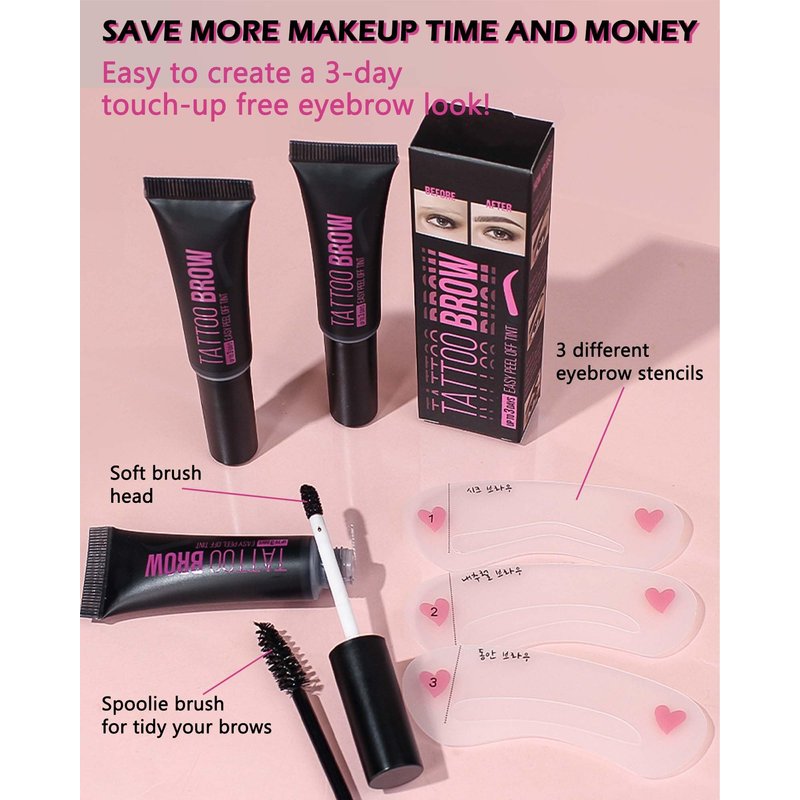 - GIFT SET - Peel off tattoo eyebrow gel with exquisite packaging design. Widely use, suitable for all types of eyebrows. With the complimentary eyebrow stencils and brush, it is even easier to create a 3-day touch-up free eyebrow look! It will be a perfect gift for your friends, female family member.