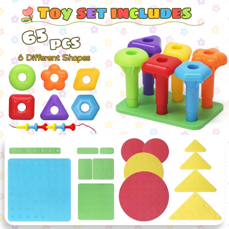 Peg Board Toy set 65Pcs DIY Building Stacking Toys for Kids 3-6 Years Old,STEM Educational Kids Toys for Brain Development,Montessori Sensory Toys,Upgrade Various Foam Board Plastic Lacing String Game