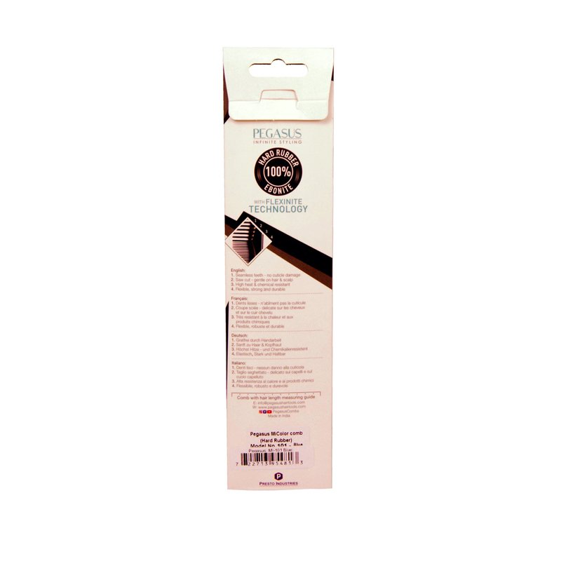 Pegasus MICOLOR 101, 8in Hard Rubber Fine Tooth Rat Tail Comb, Anti-Static, Seamless Teeth, Heat and chemically resistant. Hand crafted from hard rubber, with Flexinite Technology, these amazing combs are temperature and chemically resistant. Professional grade, durable, strong, lightweight, portable won't tangle hair and lose hair. Best for hairstyling, detangling, parting hair, back combing, hair coloring and post styling hair. Thick hair, thin hair, curly hair, all hair types. Smooth, durable and comfortable seamless teeth avoid pulling or tangling hair. It glides through your hair and allows you to shape your hair, adds brilliant shine and luster to dull hair, your hair and scalp will be healthier with regular exposure to the natural oils. Your go to comb for everyday use. Beautiful Blue Color. Comb Measures 8" Wide and 1" Tall