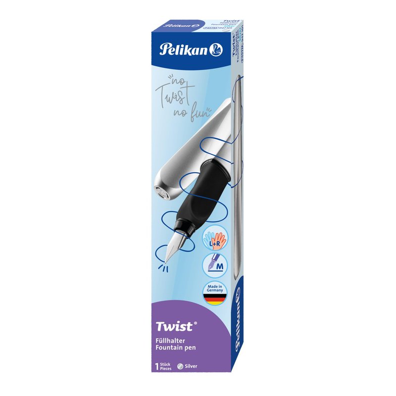 Pelikan Twist Fountain Pen with 1 Ink Cartridge, Medium Nib, Silver, Boxed (947101)