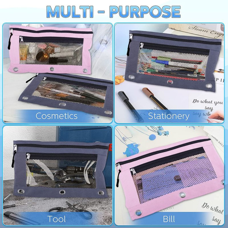 Pencil Pouch for 3 Ring Binder, 2 PCS Double Layer Binder Pencil Case with Zipper Puller, Transparent PVC Mesh Window Oxford Pencil Holder 3 Ring Binder Pencil Cases, Smooth Metal Zipper Pencil