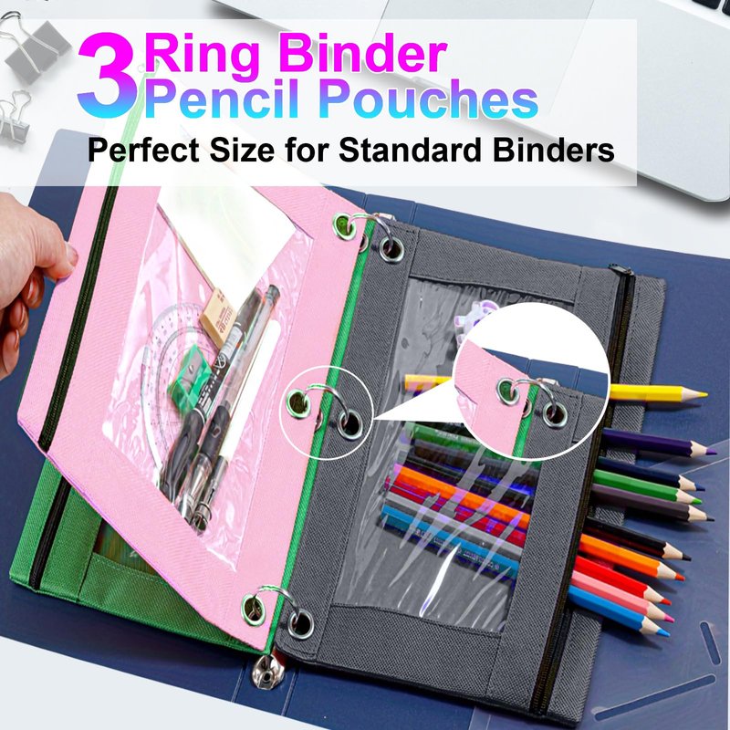 - Great Capacity: The 3 ring pen pouch size is 9.6" x 7.6" (24.4 x 19.2CM), which fits perfectly with a standard 3 ring binder. You can easily carry your stationery with enough space for 20 pencils, erasers, rulers, scissors and other stationery.