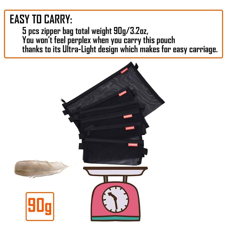 - EASY TO CARRY: 5 pcs mesh zipper bags total weight 90g, You won’t feel perplexed when you carry this pouch thanks to its Ultra-Light design which makes for easy carriage.