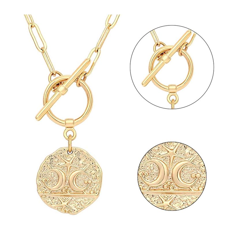 - This celestial medallion necklace is 40cm/16inch length plus 2inch extension chain. This large round disk pendant necklace made of 2 different 18k gold plated chains. Both dainty rolo chain and chunky oval link chain, created the unique look to your outfit. Finished with a big lobster clasp, easy to put on or take off.