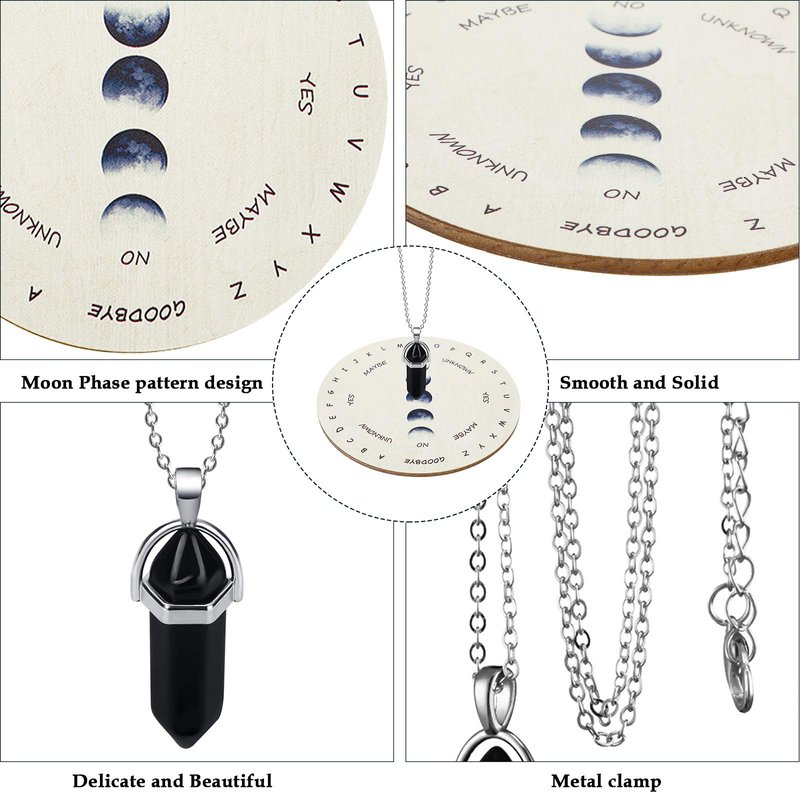 - What you get: the package comes with 1 piece of moon phase pendulum board,1 piece of crystal necklace with gold plated chain and 1 piece of velvet bag, totally 3 pieces, the complete set can meet your needs and help you to make decisions