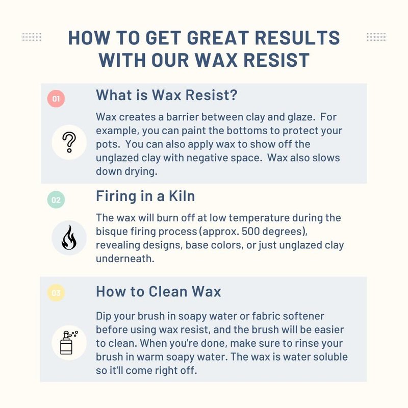 - [WHAT IS WAX RESIST?] - Wax resist creates a barrier between the clay and ceramic glaze. Wax naturally repels water and seals over the ceramic clay to keep glaze out. Our wax is made in the USA and has excellent quick drying properties with just the right viscosity so it brushes evenly and smoothly.