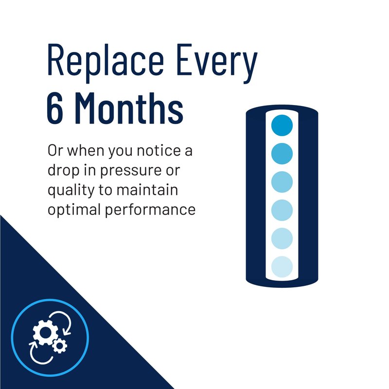 - REPLACE EVERY 6 MONTHS or when you notice a drop in water pressure or water quality for best results and performance