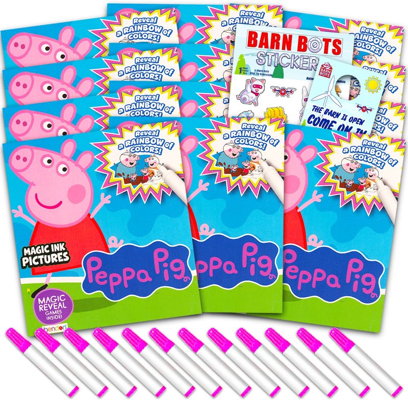 Peppa Pig Imagine Ink Coloring Book Set for Girls Boys - 12 Pack No Mess Coloring Books with Stickers, More (Peppa Pig Party Favors Bundle). This Peppa Pig gift set includes 12 Peppa Pig game books - each book contains 6 pages of no mess coloring fun and 1 mini magic ink marker. Use the magic marker to reveal a rainbow of colors on every page as you play with Peppa Pig and friends. Perfect to hand out as party favors at birthday parties for girls and boys alike. Officially licensed Peppa Pig toys and games products, great for kids and teens of all ages. Includes bonus Barn Bots stickers and Barn Bots door hanger.