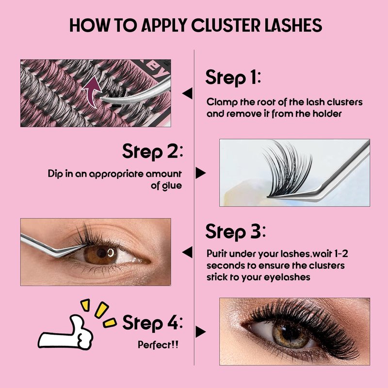- Customize your look with stackable, buildable DIY lash extension clusters – wear them any way you want to fit your personal style. Whatever light make-up, heavy make-up for your dinner party, birthday party, prom or celebrations, the individual eyelash cluster extensions stay secure and comfortable for 24 hours