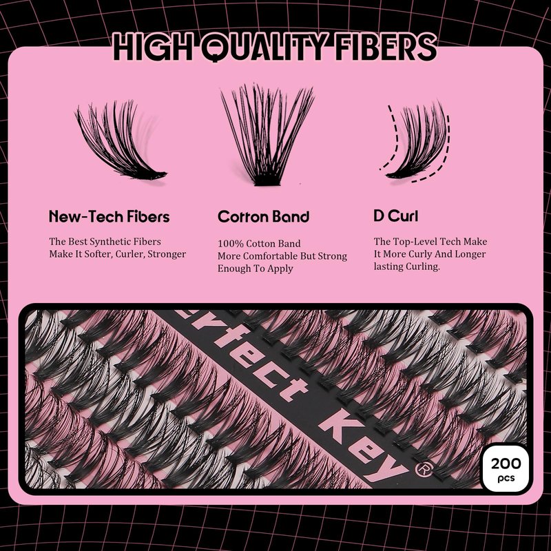 - This cluster eyelash extension is designed with a thin cotton band and soft synthetic fibers developed with the latest technology that make them ultra-comfortable for extended wear. Featuring 200 clusters of featherlight lashes that go under your own lashes, so the bands aren't visible. Every wispy lash cluster has 80 pcs of eyelashes which make them very fluffy but natural. Special synthetic fibers and curling technology make them long-lasting curling and waterproof.
